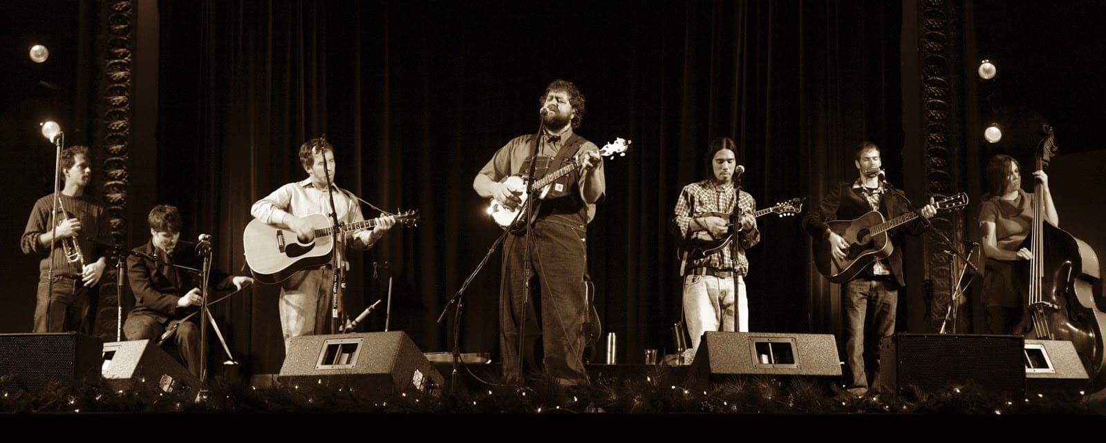 After nearly a decade of singing and picking together, Free Range Folk was founded by Shawn McCarty (Mandolin, Guitar), Joshua Finsel (Banjo, Guitar, Harmonica, Theremin), and Kevin Ruch (Guitar, Dobro, Bass). The rest of the band looks like this: Amber Breiner Finsel (Upright Bass, Electric Bass, Guitar), Brad Konstas (Percussion), Dan Ruch (Trumpet) and Sara Ruch (Washboard, Musical Saw, Boom-bah, Harmonica). Everybody lends their voices in harmony and lead vocals are usually done by Shawn, Josh and Kevin. Amber and I have been emailing back and forth a bit, so when you see the quotes here, know that it's the words of the band that she kindly assembled into one narrative for me.