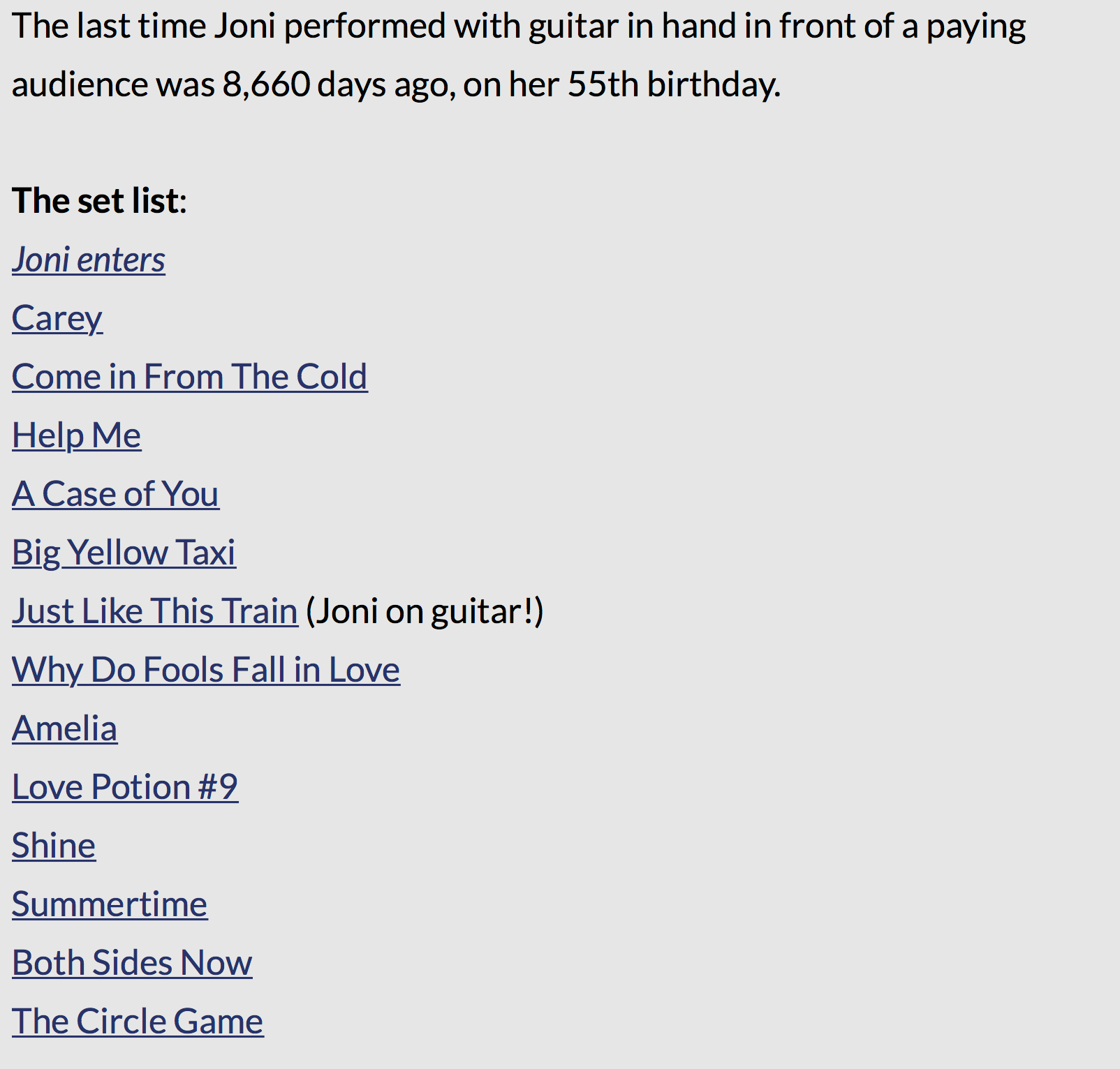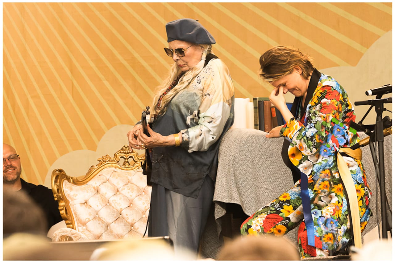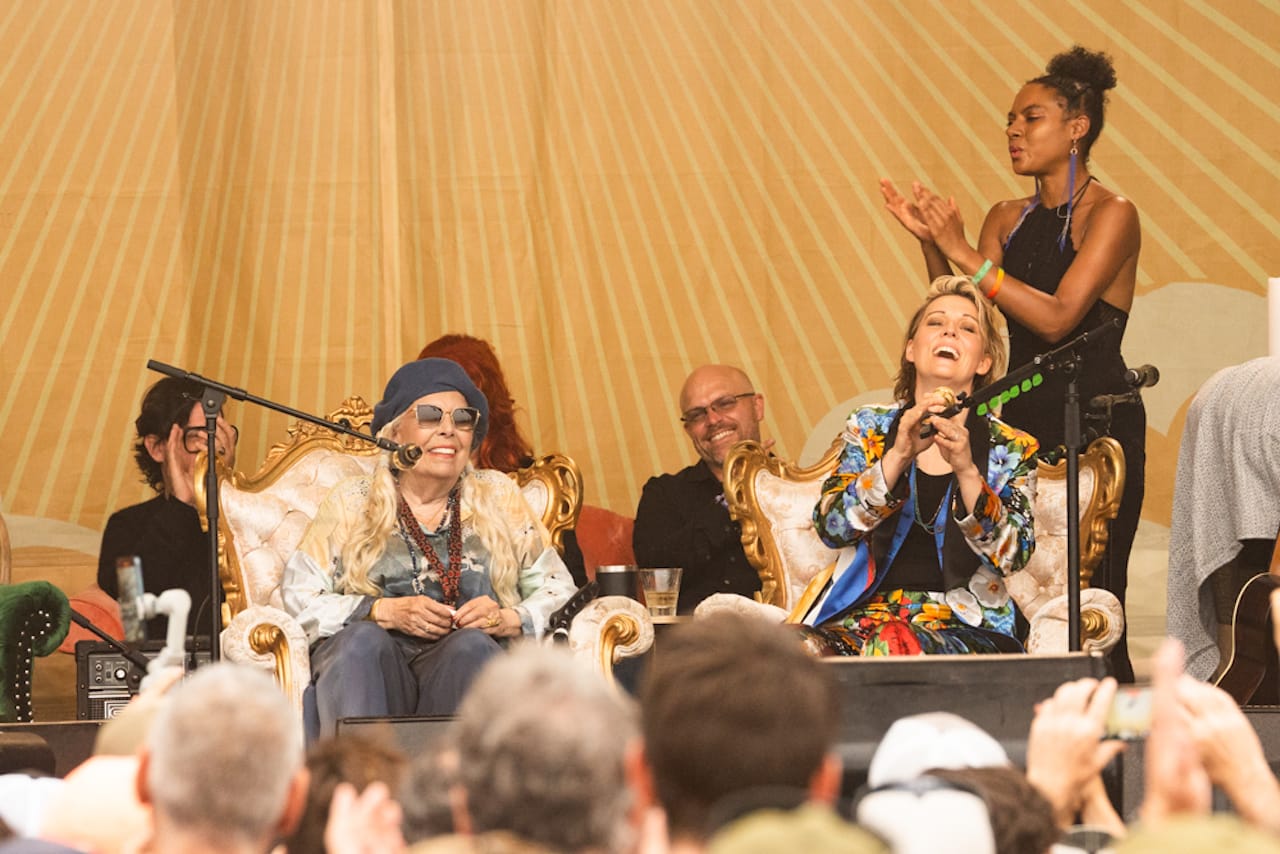 Words are inadequate to describe how fans lost their minds when Brandi Carlile welcomed Joni Mitchell to the stage on Sunday night. It had been over 20 years since Mitchell's last performance before an audience and 53 years since she was last at Newport. At 78 years of age and being in poor health for some years it was expected that she would take a seat and sing a few songs. That was not the case. During her 13-song set (a set list from her website is included in the photo gallery below), Mitchell gave us songs, stories, and, rising from her chair, treated us to one of her patented guitar solos during “Just Like This Train.” Longtime fan Wynonna Judd (who also performed at the 2000 tribute to Mitchell) later joined her for “The Circle Game.” No one could truly fathom what we had just experienced; there was not a dry eye anywhere on the grounds.