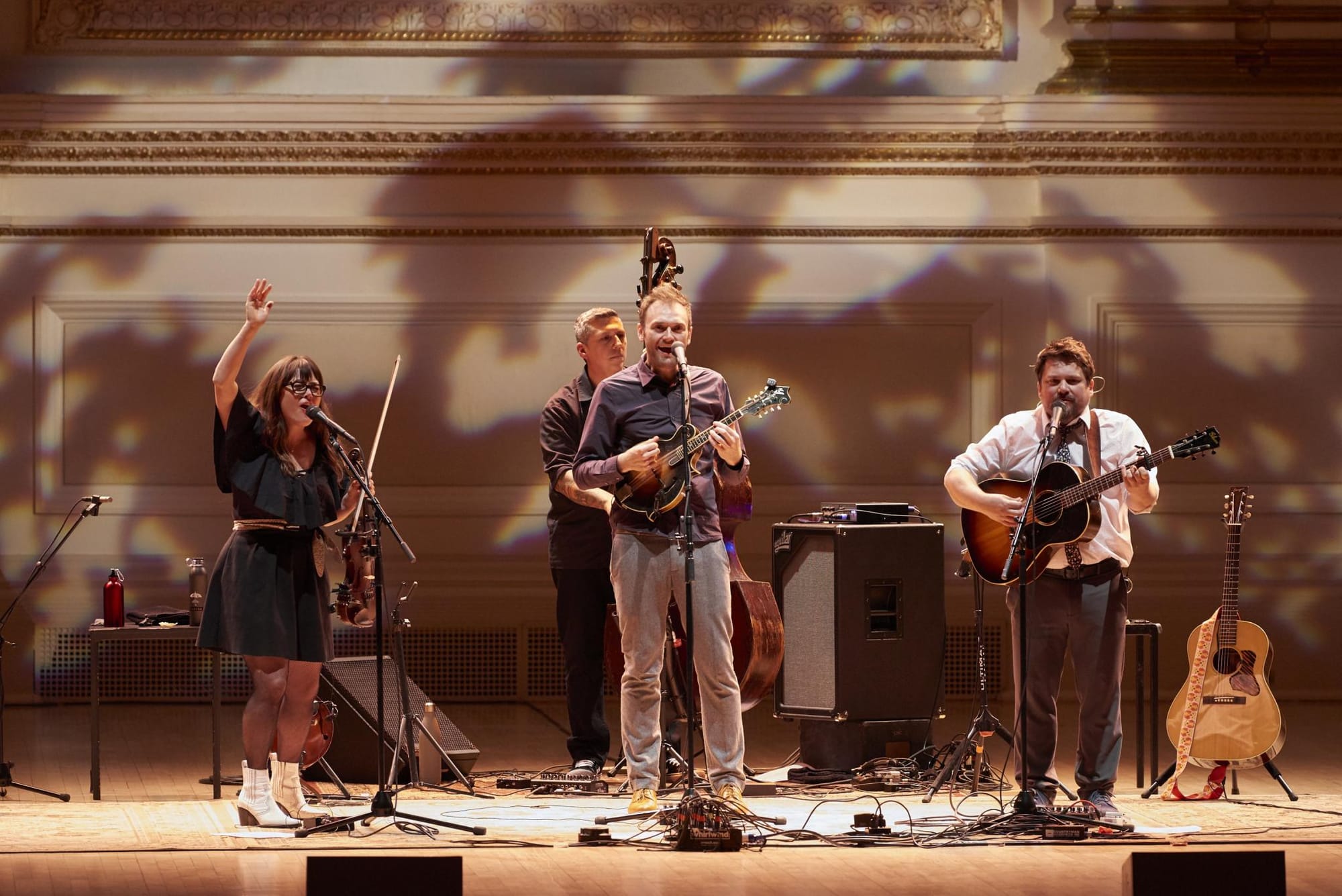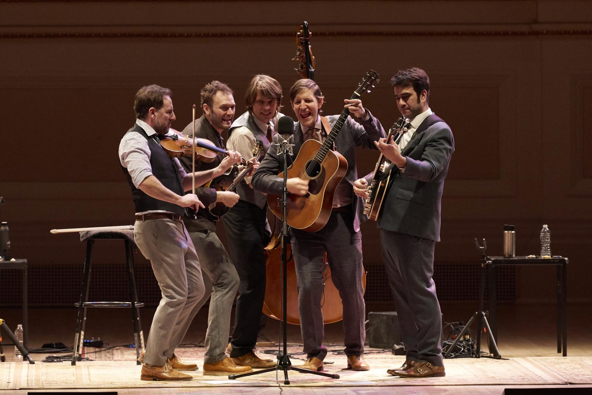 While a sold-out crowd of longtime fans is old hat for both bands, excitement and murmurs of questions around a sense of the unknown still managed to fill the room — especially on what songs from each band’s vast catalog would make each set list. Sure, pluck any audience member out of their seat and it's likely they could start singing the lyrics to Punch Brothers' opener and Phosphorescent Blues favorite “My Oh My,” or Nickel Creek's sardonic ode to the rapture, “21st of May” on cue. But the magic of the evening was about so much more than the depth of fan familiarity. Carnegie Hall being the traditional space it is, one wondered if it might stifle the energy exchanged between the audience and the bands. To a degree, the setting was different: Assigned seating, not a camera phone raised, and the initially slow rise of applause following the night's first rousing solo by Punch Brothers banjoist Noam Pikelny.