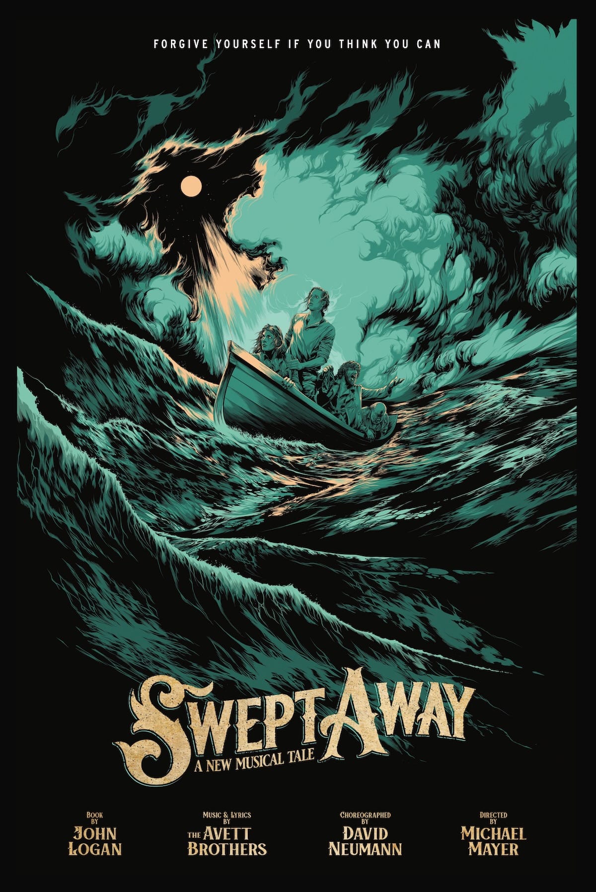 Logan shifts the setting for Swept Away off the coast of New Bedford, Massachusetts, in 1888, taking creative liberties with almost every other aspect of the narrative, too. “I wanted to be totally fictional. I wanted four men on a lifeboat. I wanted them tried by circumstance,” he says. “But I decided to write about a whaling voyage because I know a lot about whaling mostly from [Herman] Melville and it was an interesting jumping-off point. So while I was listening to the Avetts and making up some of the four characters, I was reading James Fenimore Cooper, a lot of Joseph Conrad, a lot of Melville, and Two Years Before the Mast by Richard Henry Dana. I was doing a very deep dive into nautical literature and artists who had looked at the sea as a great metaphor to explore the human condition.”
