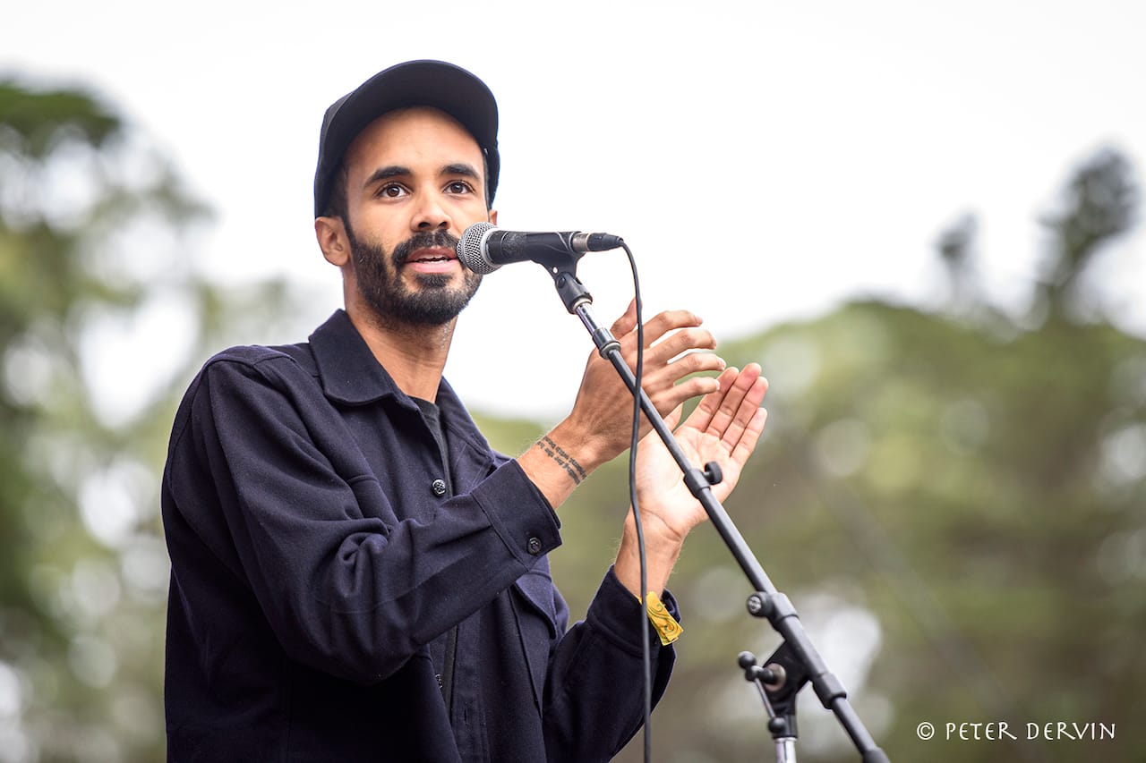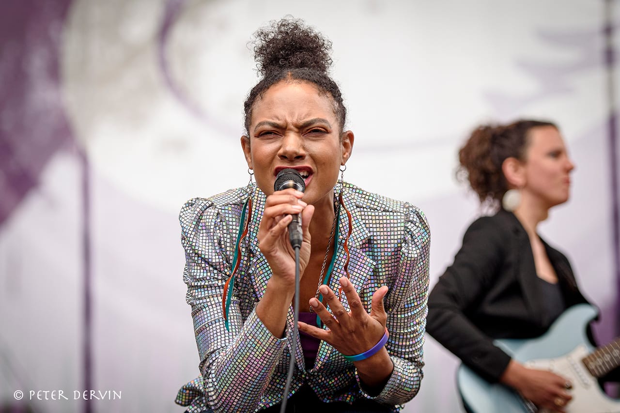 There has been considerable national interest in the collective voices of the Black Opry Revue. Here we were mesmerized by three members of that rotating revue: Lizzie No, alternating between harp and guitar, played a nice set of pop folk tunes; Leon Timbo, whose physical and vocal presence absolutely brought you to church with a moving and emotional set; and O.N.E. the Duo, a mother-and-daughter vocal group who did a fun set of harmonic tunes that had everyone dancing.